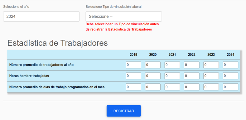 Permite registrar trabajadores según su tipo de vinculación y contratante. Para realizar un registro, seleccione el tipo de vinculación o contratante en la opción correspondiente. A continuación, ingrese los datos para cada año y de clic sobre el botón